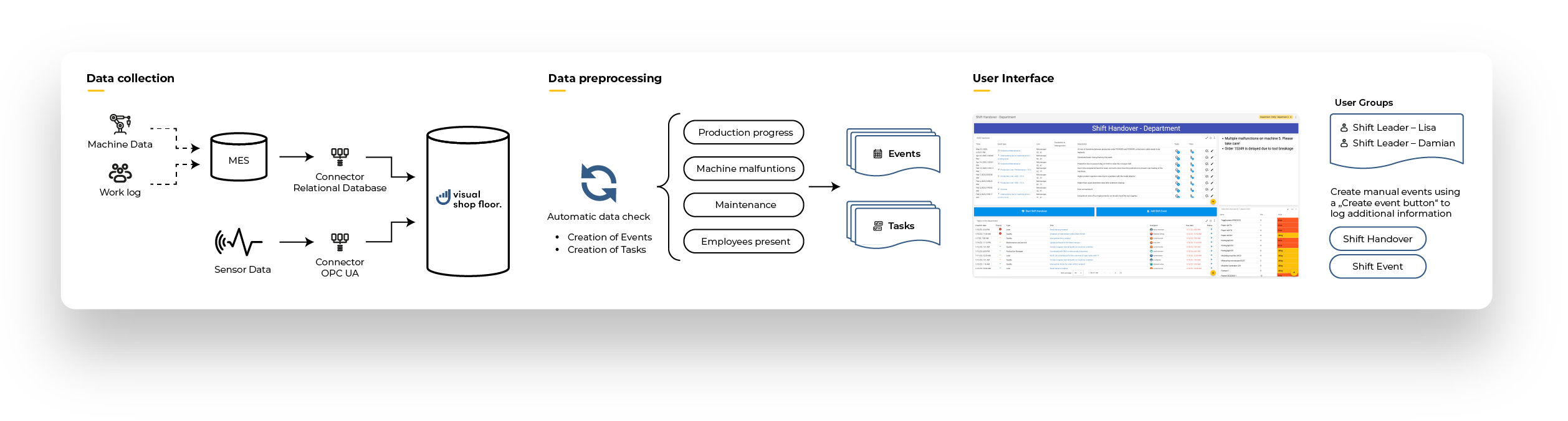 Kern der Lösung ist ein strukturiertes Ereignisprotokoll, in dem sowohl manuell erfasste als auch automatisiert übermittelte Ereignisse dargestellt werden. Um Daten aus Maschinen und aus dem MES in der Prozessüberwachung nutzen zu können, werden diese Systeme über die in Visual Shop Floor bereits vorhandenen Konnektoren angebunden.
