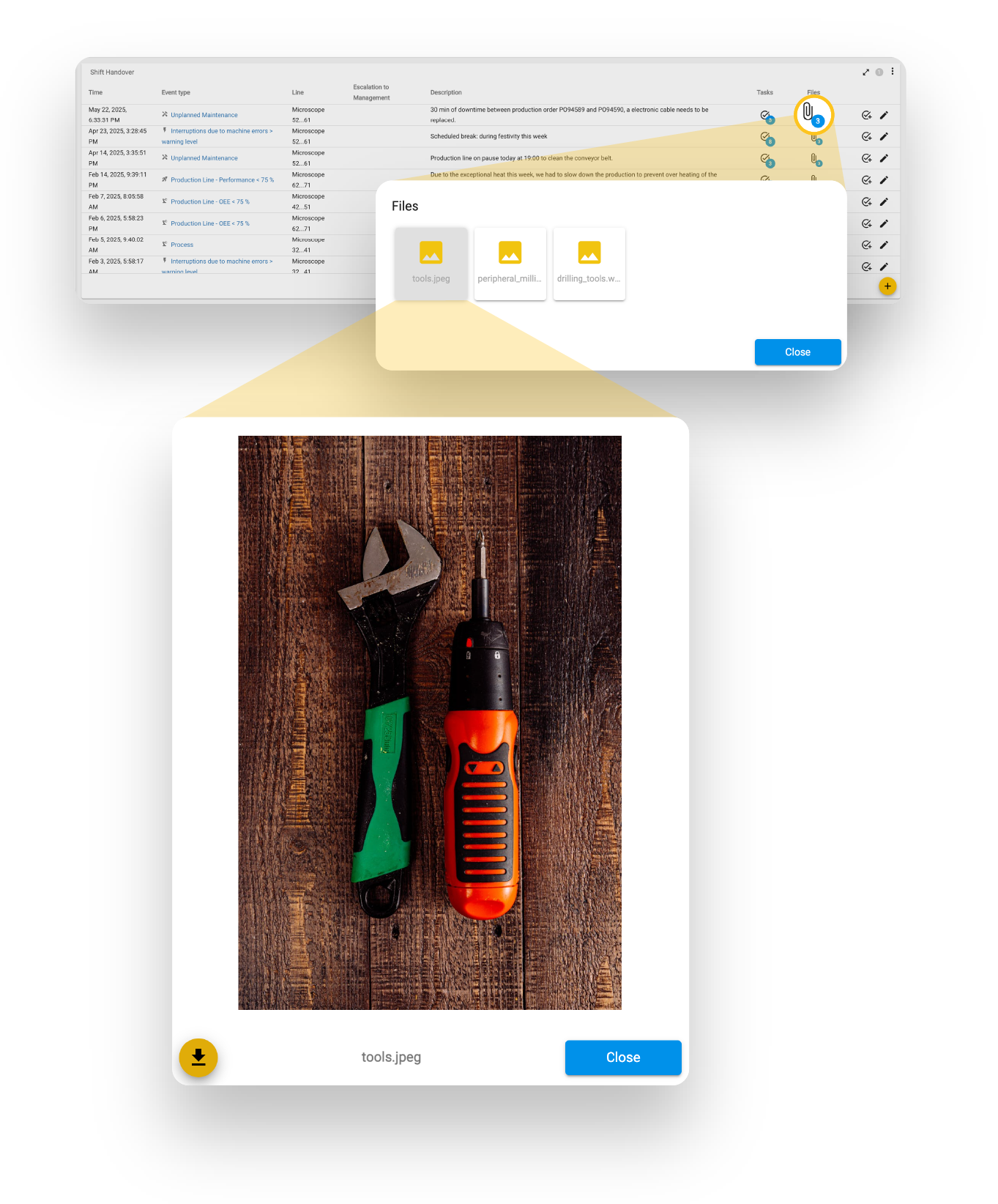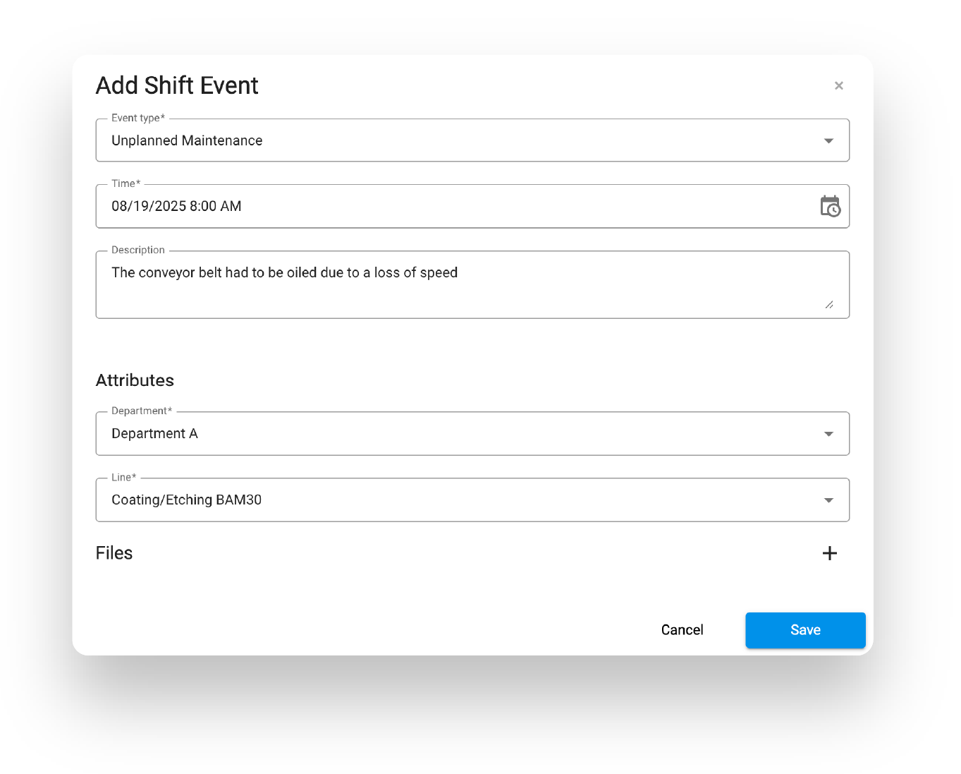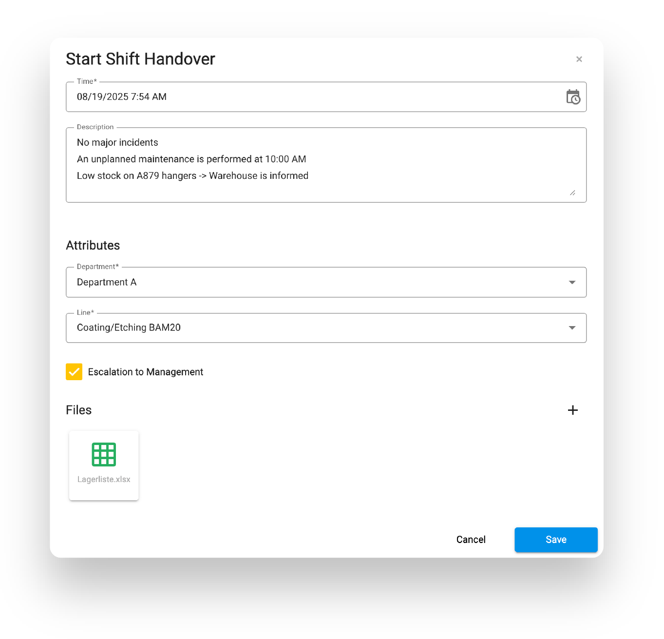 Alle relevanten Ereignisse während der Schicht müssen vollständig erfasst werden – sowohl manuell durch das Personal als auch, wo möglich, automatisiert über Schnittstellen (z. B. Maschinendaten, Anlagenmeldungen). Dazu zählen auch besondere Vorfälle wie Sicherheitsereignisse, Qualitätsprobleme, technische Ausfälle oder Fehlteile.