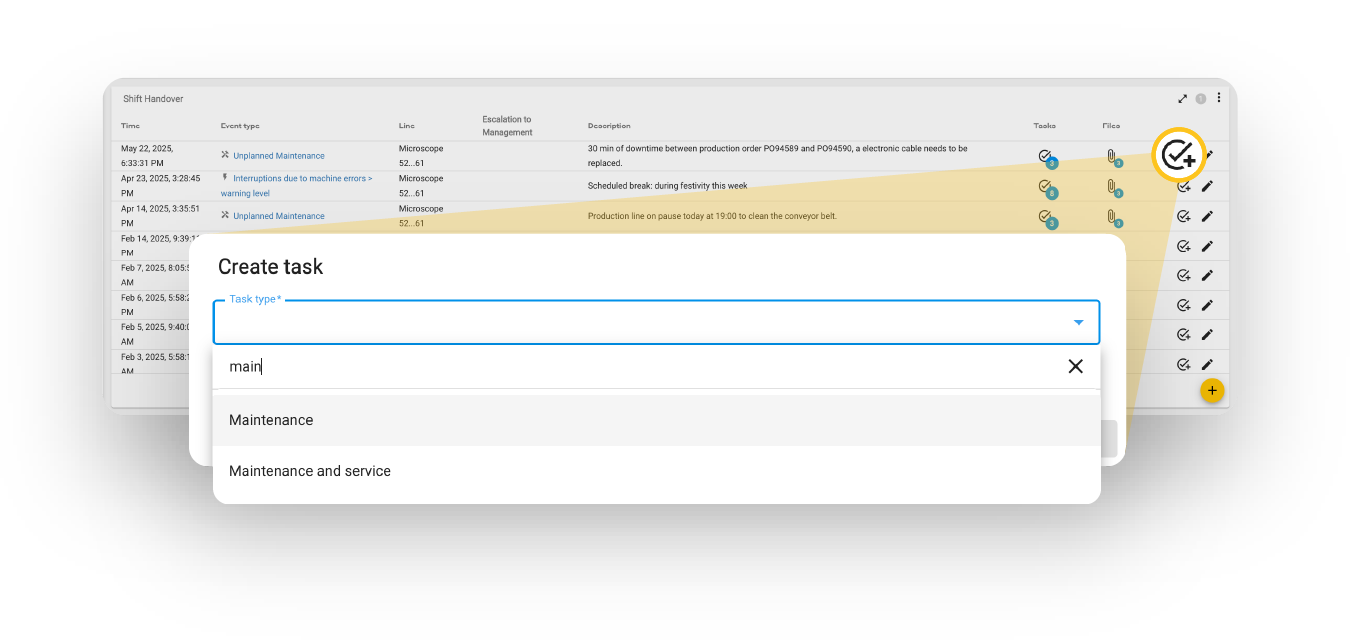 Bei der Schichtübergabe steht dadurch eine vollständige und transparente Ereignishistorie zur Verfügung. Durch die direkte Verknüpfung mit dem Task Management können aus jedem Ereignis unmittelbar Folgeaufgaben generiert werden, die automatisch an die zuständigen Mitarbeiter oder Teams übergeben werden – auch schichtübergreifend. So ist jederzeit klar, wer für die Bearbeitung zuständig ist, was zu tun ist und bis wann es erledigt werden muss.