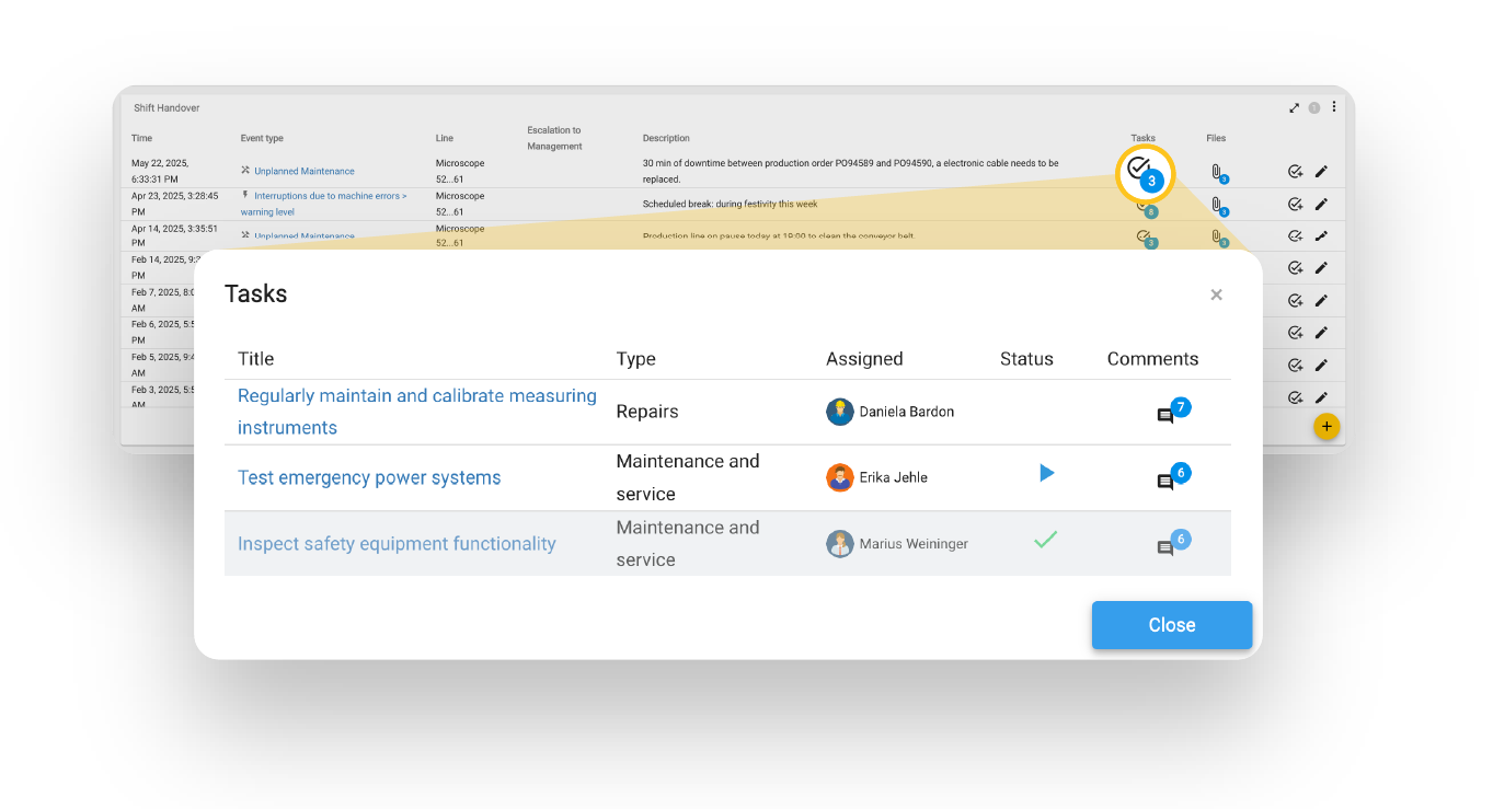 Ein weiterer Vorteil ist die schichtübergreifende Kontinuität: Aufgaben, die in einer Schicht erstellt wurden, bleiben im System präsent und werden automatisch an die nächste Schicht übergeben – inklusive Status und Historie. So geht keine Maßnahme im Übergang zwischen Schichten verloren, und der Bearbeitungsfortschritt bleibt jederzeit transparent.