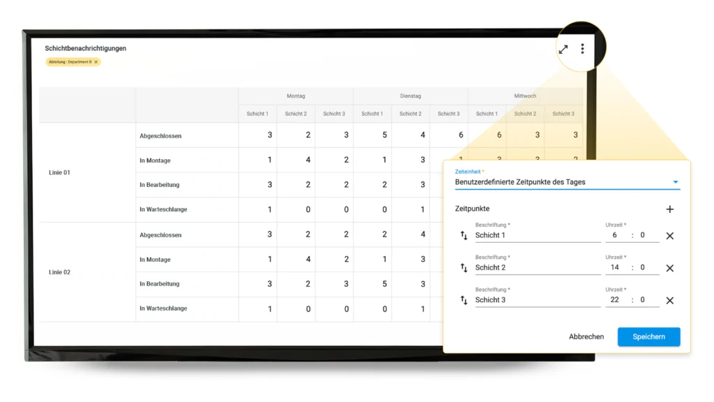 Mit der Dateneingabe über die Zeittabelle können Rückmeldungen strukturiert erfasst werden. Durch die flexible Verknüpfung der Eingaben mit frei definierbaren Datenstrukturen (Modelle) können vielfältige Anwendungsfälle wie beispielsweise Meldungen von gefertigten Stückzahlen, Ausschuss-Meldungen etc. implementiert werden.