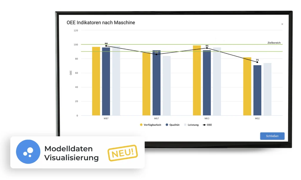 Häufig ist es von Bedeutung, verschiedene Kennzahlen und Metriken gegenüberzustellen und vorhandene Zusammenhänge zu erkennen. Dafür bietet Visual Shop Floor mit dem Multiline-Chart die Möglichkeit, Linien-, Balken- und Punktdiagramme in einer gemeinsamen Ansicht zu kombinieren. Mit der neuen Version ist es nun möglich, das Multiline-Chart auch für Modelldaten zu nutzen und damit Zusammenhänge in den in Visual Shop Floor gespeicherten Daten besser aufzuzeigen. Somit steht eine weitere wichtige Funktion zur Verfügung, die Ihren Mitarbeitern die optimale visuelle Darstellung für das Prozessmonitoring bietet.