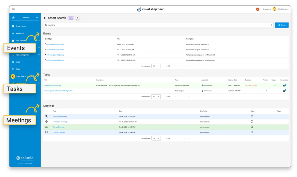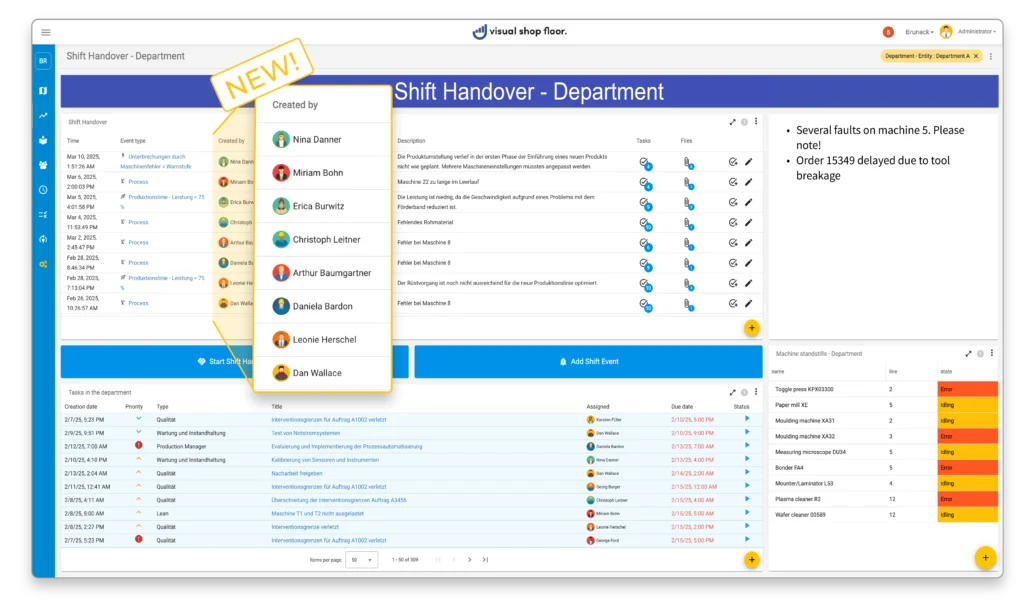 In Visual Shop Floor werden kontinuierlich wichtige Informationen erfasst und gespeichert. Insbesondere Notizen aus Shop Floor Meetings, Kommentare zu Aufgaben und Beschreibungen von Ereignissen bilden eine wertvolle Wissensbasis. Diese kann bei aktuellen Herausforderungen und Problemstellungen eine entscheidende Unterstützung bieten.