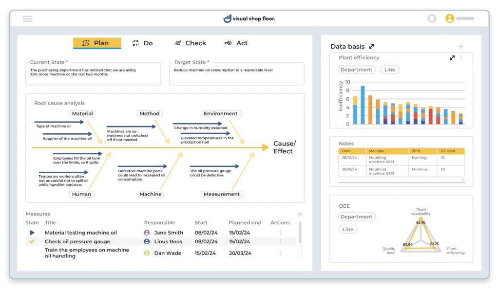 Visual Shop Floor is the ideal platform for designing the CIP process in a contemporary way and establishing a positive improvement culture together with your employees. With continuously updated key figures, combined with task management and established methods from LEAN management, you create the ideal basis for a flexible way of working and for the motivation of your employees as a central driver for process optimization.