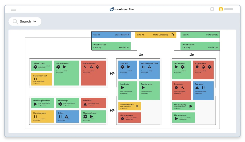 Visual Shop Floor offers a wide range of possibilities to improve efficiency, productivity and quality in production and logistics. Through the systematic, software-based application of established methods, your company's LEAN initiatives are strengthened and operational efficiency is increased, giving your company a sustainable competitive advantage.