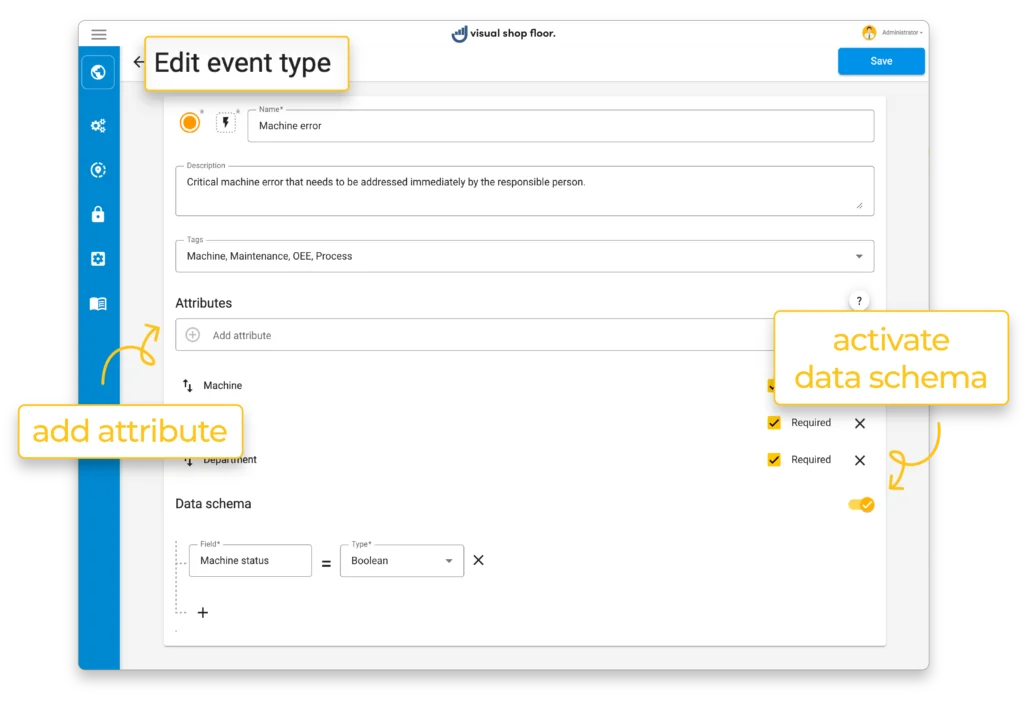 La gestione degli eventi in Visual Shop Floor è uno strumento indispensabile per il monitoraggio e il controllo efficienti dei processi produttivi. Grazie alla possibilità di definire tipologie specifiche di eventi, è possibile aggiungere attributi dedicati e garantire una descrizione dettagliata di ogni evento.Gli attributi fungono da elementi fondamentali per la raccolta dei dati, consentendo la definizione di specifiche tipologie di dati come numeri, testi o drop-down. Questo permette un inserimento semplice e intuitivo da parte dell'utente, oltre a garantire una valutazione efficiente delle informazioni inserite.