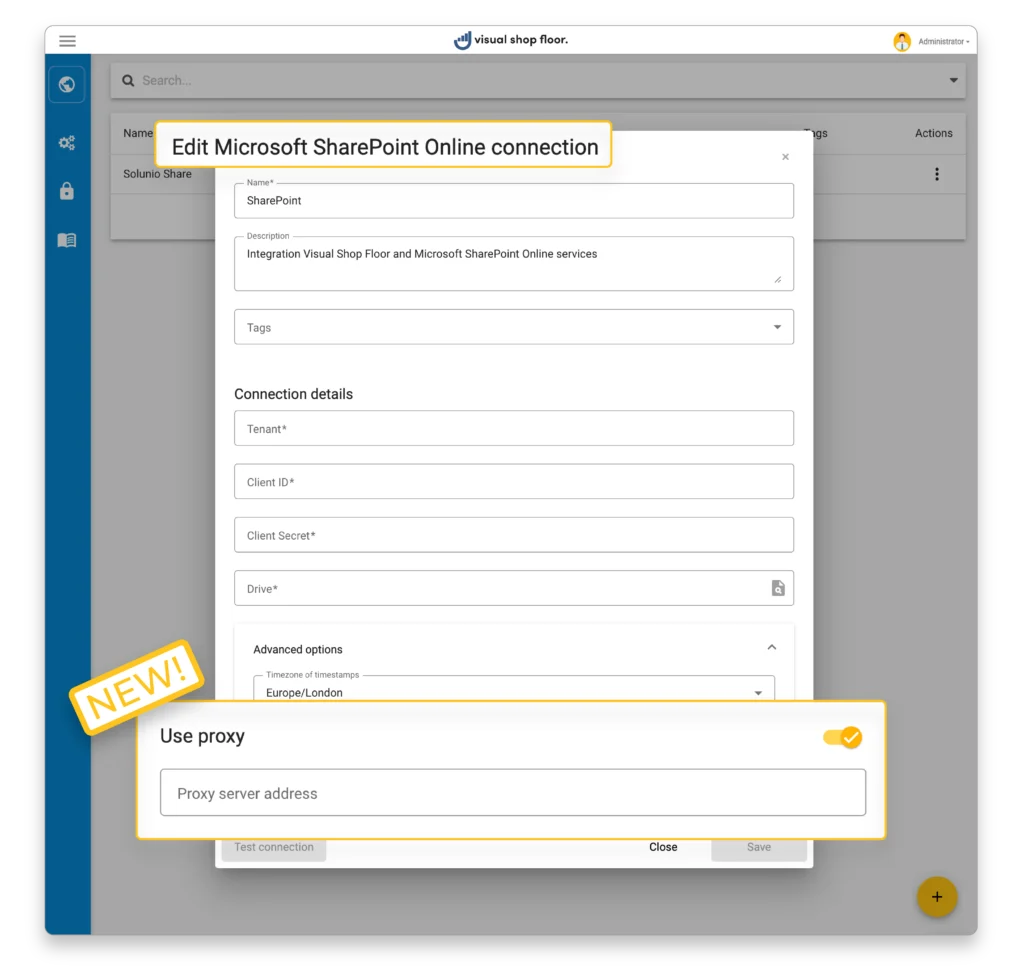 Grazie alla possibilità di utilizzare un HTTP Proxy in combinazione con SharePoint Online, l'uso dei documenti in Visual Shop Floor diventa ancora più flessibile e viene garantita la conformità con le politiche di sicurezza esistenti.